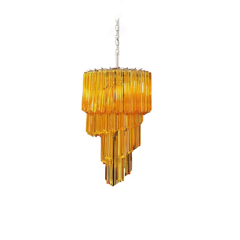 Amber Murano Glass Prism Spiral Chandelier is a gorgeous and unique chandelier, whose design combines warm amber Murano glass prisms with elegant spiral shapes to create an attractive visual effect. This chandelier features a layered spiral structure, and the amber glass prisms emit a soft golden glow under the light, bringing a luxurious and warm atmosphere.