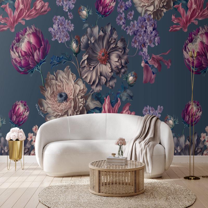 Introducing the epitome of wall dcor elegance: the exclusive Aspiring Walls Wallpaper Mural in the Annah Stretton striking Floriana print on a blue background. Crafted to transform your space into a realm of artistry and sophistication, this mural sets a new standard in interior design.
