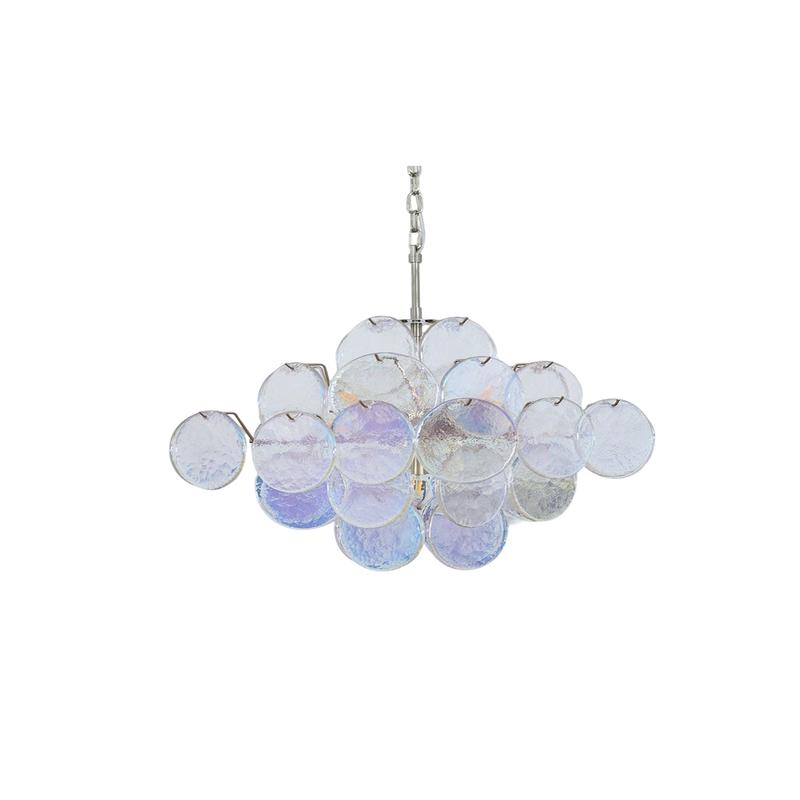 The Aurelia Iridescent Murano Chandelier blends traditional Italian craftsmanship with modern elegance. Hand-crafted Murano glass discs shimmer in soft iridescent tonesfrom gentle purples to subtle blues and greenscreating a tranquil, luminous aura. Suspended from a sleek nickel frame, this chandelier becomes a luminous focal point, infusing dining spaces, living rooms, or entryways with refined artistry and ambient sophistication.