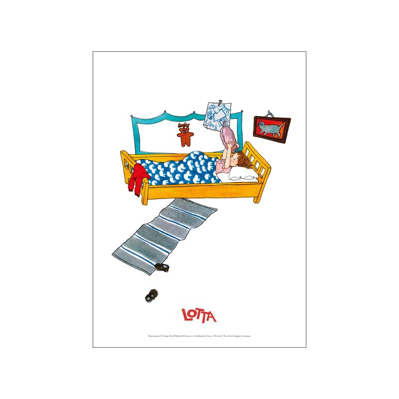 This enchanting Lotta poster depicts a serene bedtime scene as Lotta hugs her toy pig under soft blue blankets. Perfect for creating a calming bedtime atmosphere in childrens rooms.