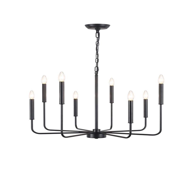 Make a timeless statement with the 8-Light Farmhouse Black Iron Classic Candle Chandelier. Blending farmhouse charm with modern sophistication, this chandelier features gracefully curved arms finished in matte black iron for an elegant yet rustic appeal. Its eight evenly spaced candle-style lights provide balanced illumination, creating a warm and inviting atmosphere. Perfect for enhancing your dining room, living room, foyer, or bedroom, it brings effortless style and classic character to any space.