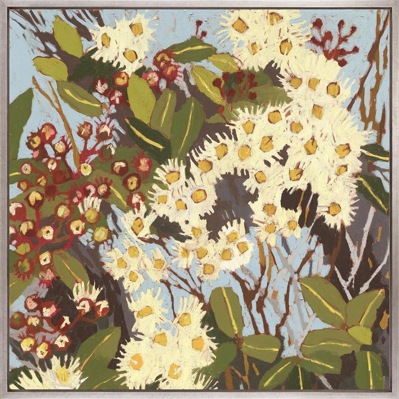 A tactile study of native florals each bloom rendered with visible brushstrokes and an earthy, textured hand.
