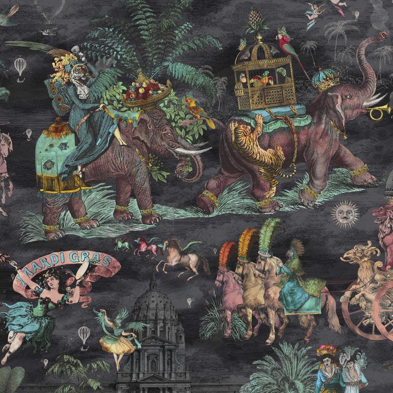 Fiesta wallpaper by Brand McKenzie, a vibrant and playful design that captures the excitement and energy of a carnival coming to town. With majestic elephants and other exotic animals marching in front of grand buildings, and the sound of music filling the air, this wallpaper transports you to a world of vibrant colours and whimsical imagery. The hot air balloons, clouds, and sun in the sky add to the playful atmosphere, making Fiesta wallpaper the perfect choice for those looking to add some fun and personality to their space.