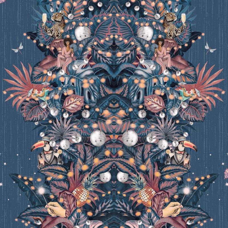 Paradise Party is a maximalist tropical dreamland where nature meets nightlife in an opulent celebration of the wild and the whimsical. Lush botanical layers form a mirrored, symmetrical composition that draws the eye into a fantastical jungle teeming with hidden surprises – from disco ball ornaments and sparkling fairy lights to well-dressed toucans and giraffes in oversized glasses.