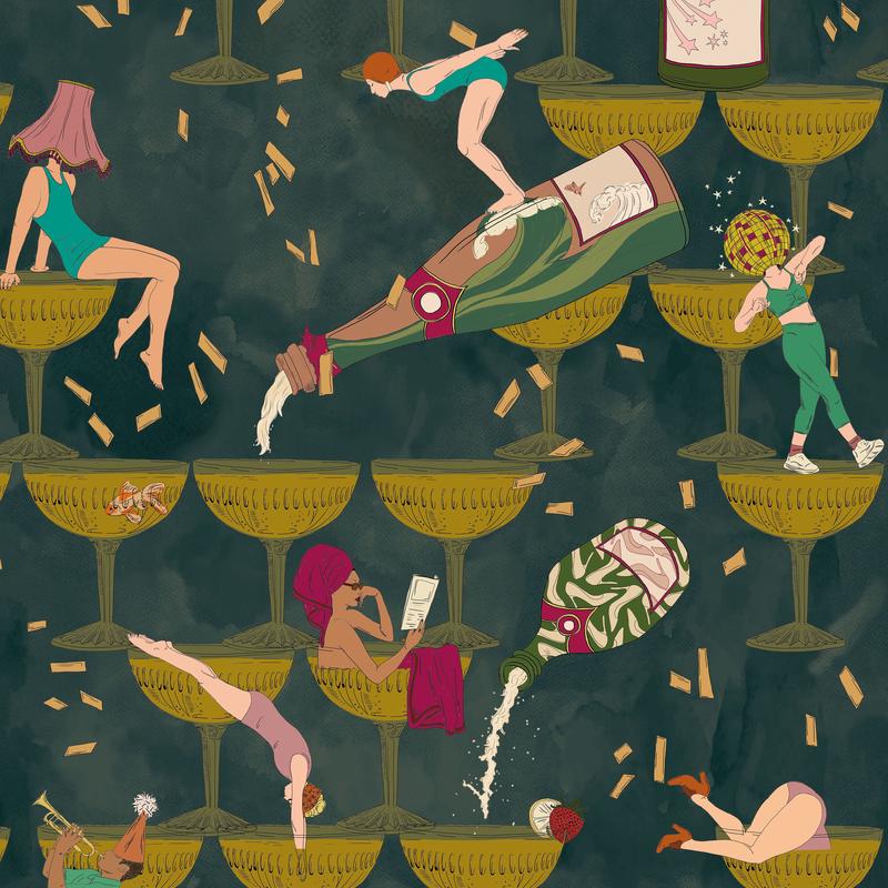 The Grand Pour is a celebration of indulgence, whimsy, and imagination. This playful wallpaper design features a cascading tower of vintage champagne glasses, each one hosting a scene of fantastical leisure – from lounging mermaids and pampered pets to dynamic dancers and unexpected aquatic life. Bursting champagne bottles and swirling confetti add movement and festivity to the composition, making every glance feel like part of an ongoing celebration.