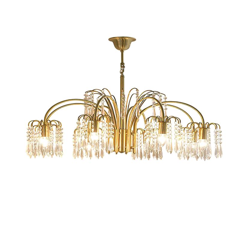 The Brass Halo Arched-Arm Crystal Chandelier combines artistic design with modern sophistication. Featuring elegantly curved brass arms that extend outward in a radiant halo form, each gracefully supports sparkling crystal accents that reflect light beautifully throughout the room. Ideal for living rooms, dining areas, hallways, or elegant cafs, this chandelier serves as both a stunning decorative centerpiece and a source of warm, inviting illumination, adding a touch of luxury and refinement to any interior.