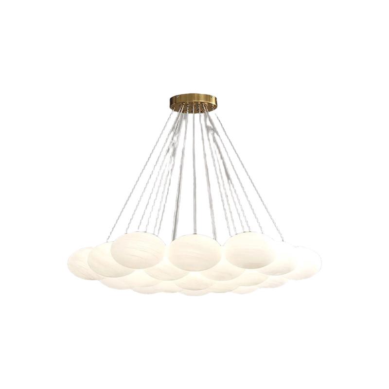 This Bubble Glass Cluster Chandelier features a gold metal lamp holder and frosted glass globe shades, perfectly complementing any decor. With adjustable hanging wire links, it is suitable for various ceiling heights. The 150-millimetre diameter of the glass globe provides a warm, even glow, enhancing any space with its simple yet versatile design.