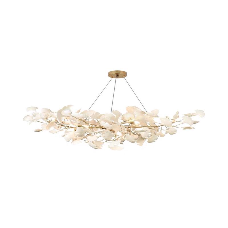 This ginkgo chandelier showcases a luxurious style through its design, materials, and manufacturing techniques. Its brass body is adorned with delicate ceramic petals, resulting in a perfect blend of lighting and nature. The bespoke Gingko Chandelier features handcrafted porcelain leaves, creating a captivating interplay between the ceramic and light. Beyond its functional use, this light sculpture emits a warm, welcoming atmosphere and serves as a mesmerizing piece of art. Its dynamic energy, reminiscent of a living plant, has a calming and revitalizing effect. The installation’s design seamlessly integrates with the architectural space and reflects the vision of architects and interior designers.