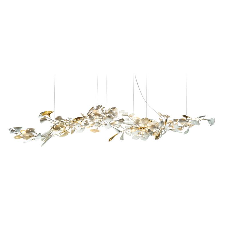 The ceramic Gingko Chandelier showcases its opulent elegance through its overall design, materials, and manufacturing techniques. The brass lamp body is adorned with delicate ceramic petals, embodying the perfect fusion of lighting design and natural flora. These chandeliers are custom-made installations, meticulously crafted from porcelain leaves. The interplay between ceramic and light produces a sense of comfort and warmth. Beyond its primary purpose of illumination, this light sculpture also defines its own shape and presence, captivating as an artistic masterpiece. Much like a living plant, it exudes a natural, dynamic energy that brings calmness and revitalization. The design of these installations seamlessly integrates with the architectural space and the vision of the architects and interior designers.