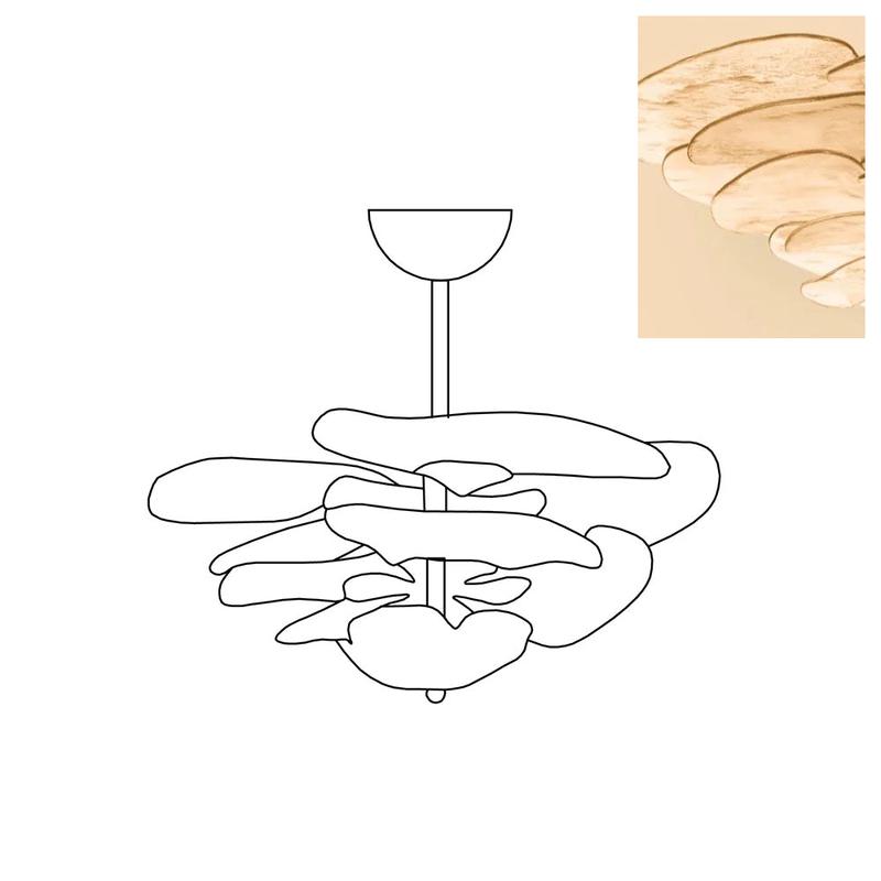 The Champagne Glass Chandelier elegantly elevates any space with its textured glass leaves. The brass structure features individually mounted champagne petals, mimicking a lily pad flower. Not only does it add a touch of sophistication, but it also creates a cozy atmosphere.