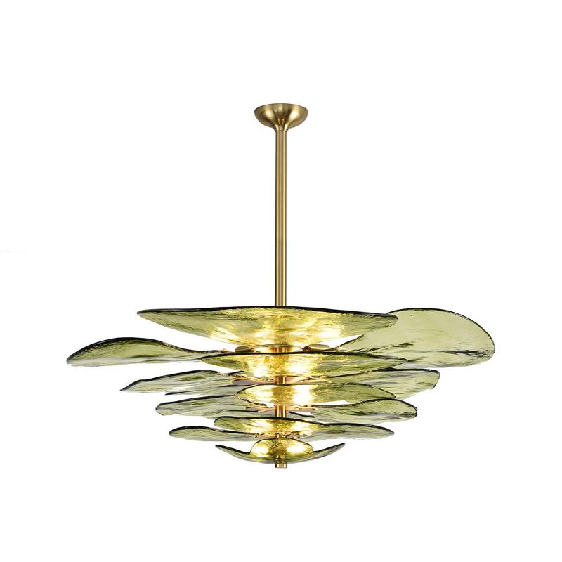 This Chandelier Green adds a touch of elegance to any room with its textured glass blades and brass structure resembling a lily pad flower. The individual pink petals create a comfortable and inviting atmosphere, making it the perfect addition to your home decor. Elevate your space with this unique and stylish chandelier.