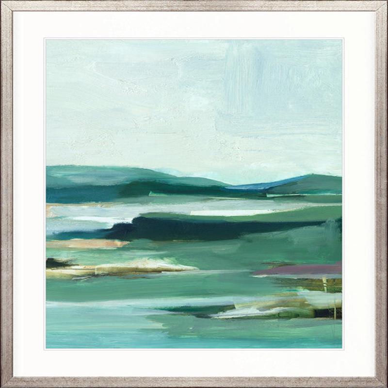 Soft brushstrokes in muted greens, deep teal, and gentle blues evoke peaceful coastlines and misty horizons – bringing calm, understated beauty and a serene, natural atmosphere to contemporary interiors.