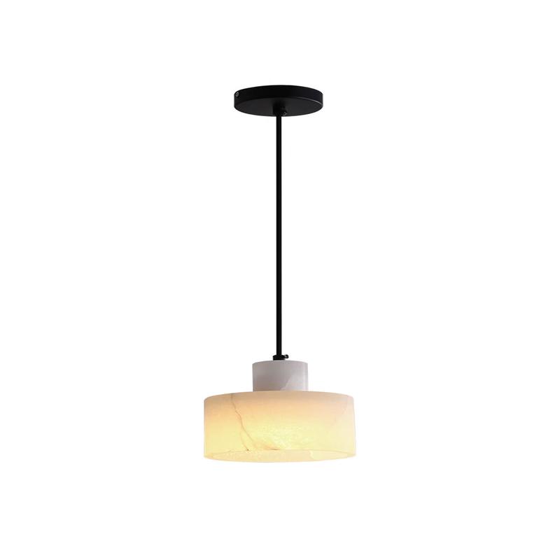 The Cyls Pendant Lamp emits a sophisticated and cozy glow, suspended from above. It showcases a 3D design and is adorned with a lampshade crafted from hand-cut and polished alabaster.