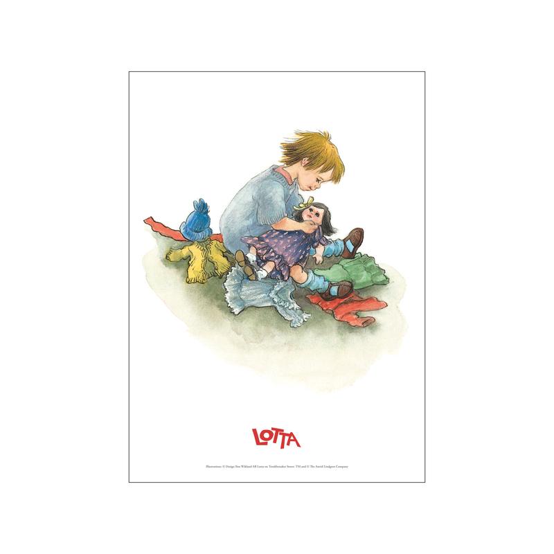 Celebrate childhood play and imagination with this tender Lotta illustration. Seated on a pile of clothes, Lotta tenderly cradles her beloved doll, capturing the simple joys and warmth of Astrid Lindgrens stories. Ideal for nurseries and childrens interiors.