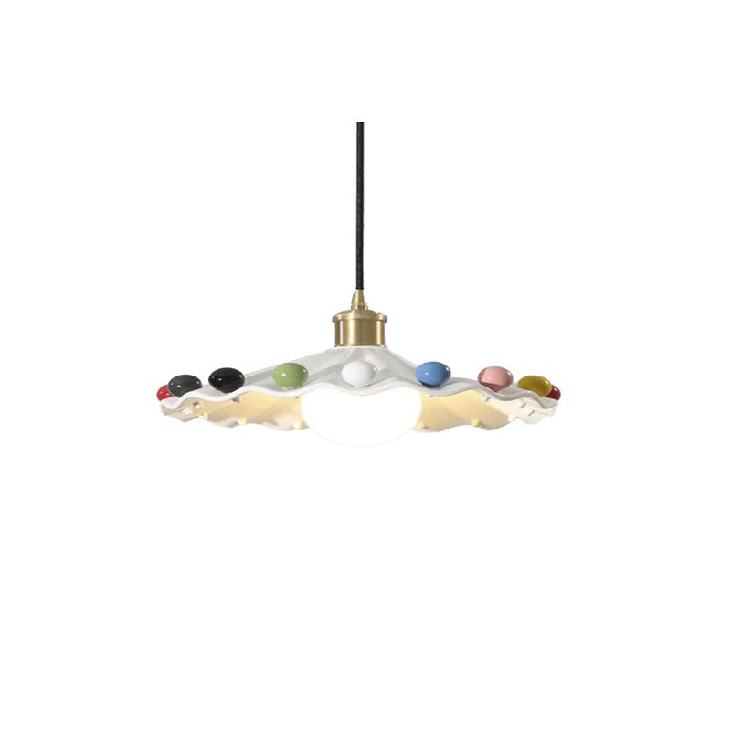 The Dopamine Rainbow Wave Pendant Light features a hand-glazed ceramic shade that emanates a rainbow of hues, seamlessly blending handmade pottery with polished brass hardware. The lustrous glaze shifts colors like liquid light, transforming the ceiling into an elegant gallery of color.