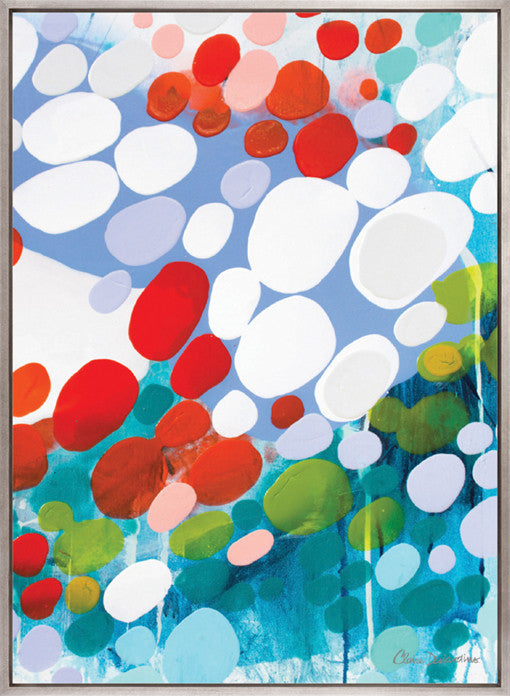 A vibrant cascade of bold turquoise, sunny yellows, and playful pops of red and lilac – this energetic abstract brings joyful colour, movement, and a lively, uplifting spirit to modern interiors.