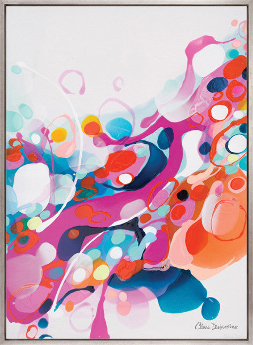 A vibrant cascade of bold turquoise, sunny yellows, and playful pops of red and lilac – this energetic abstract brings joyful colour, movement, and a lively, uplifting spirit to modern interiors.