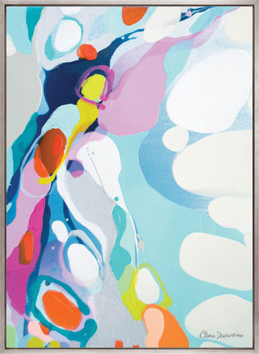A vibrant cascade of bold turquoise, sunny yellows, and playful pops of red and lilac – this energetic abstract brings joyful colour, movement, and a lively, uplifting spirit to modern interiors.