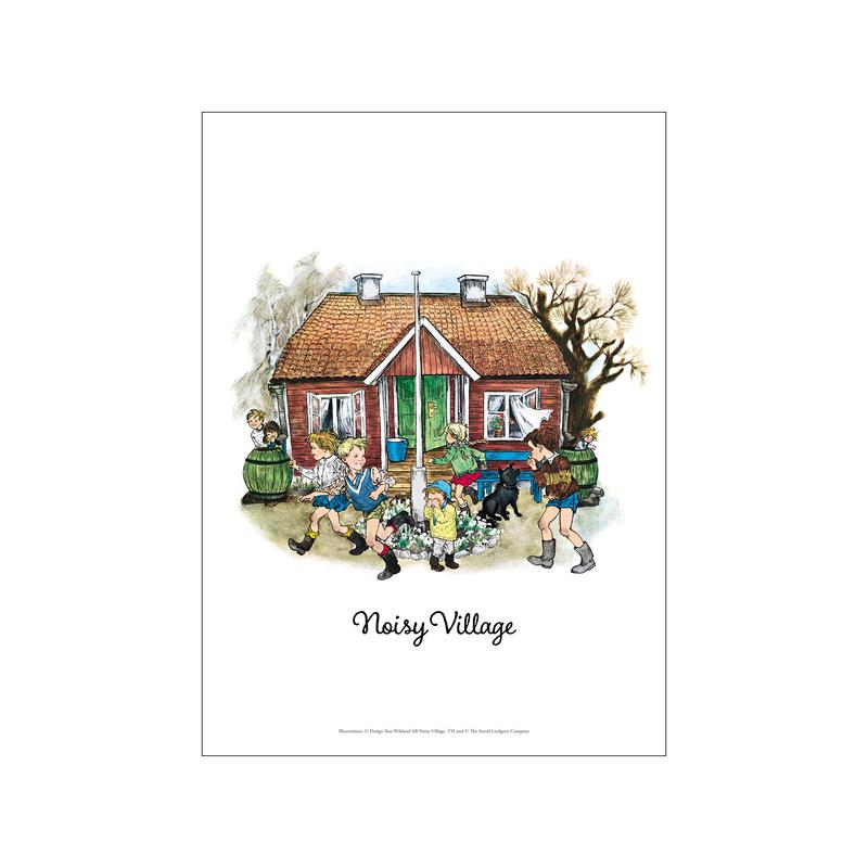 This delightful poster shows the children of Noisy Village busy in front of a traditional red house, surrounding the flagpole. This illustration celebrates community, tradition, and outdoor play.