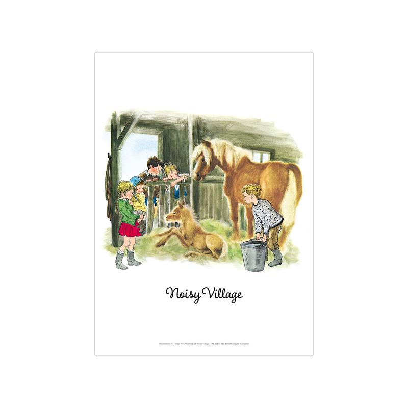In this heartwarming Noisy Village scene, the children gather in the stable to welcome a newborn foal. The gentle horse and soft hay bring a sense of rural life and harmony, while Astrid Lindgrens beloved characters watch in awe. A perfect celebration of nature and friendship, this detailed illustration adds countryside magic to any wall. Ideal for horse lovers and fans of nostalgic Scandinavian art.