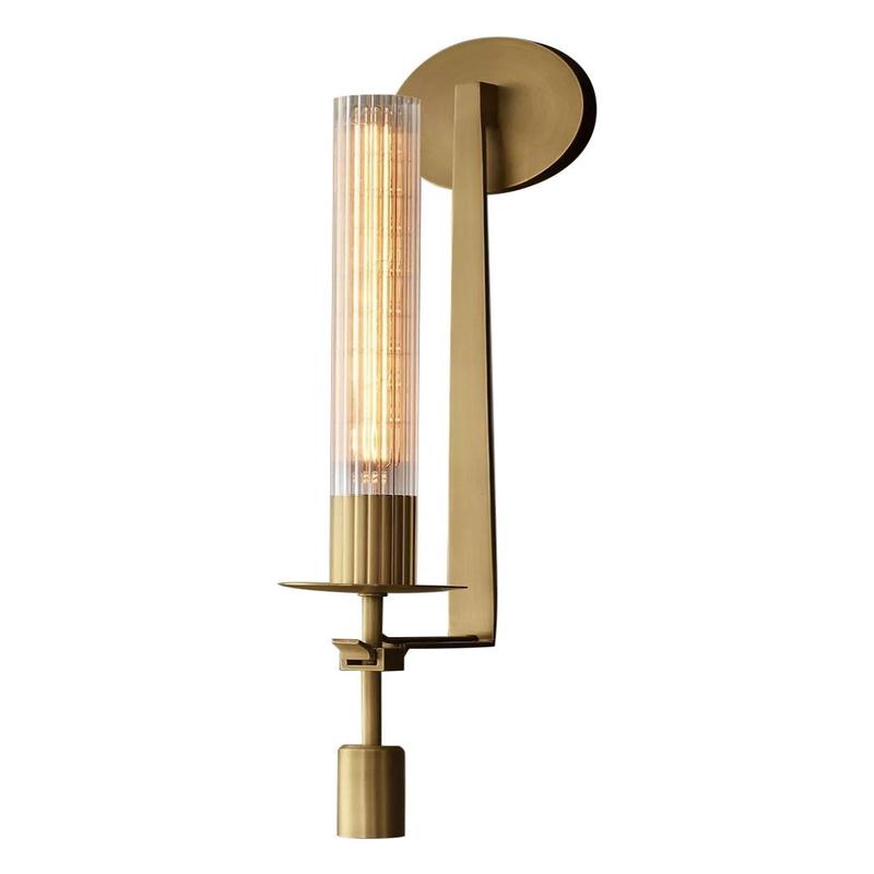 This wall lamp is expertly crafted from solid brass and features a simple design. It includes Edison bulbs enclosed within ribbed glass cylinders, creating a captivating candle-like effect.