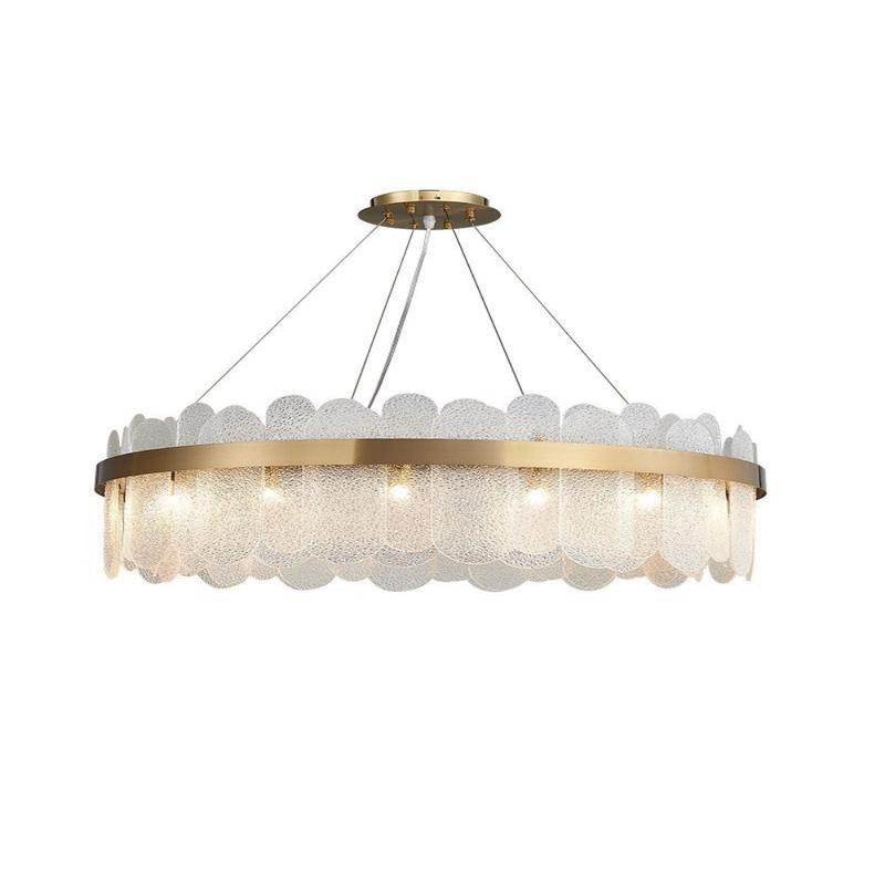 The Gold Ring Chandelier effortlessly combines vintage and modern styles, featuring a streamlined design with multiple layers of oval glass and a brushed gold ring. Its simple yet elegant design makes it a perfect choice for any home or commercial space. Add a touch of sophistication to your living room, dining room, bedroom, kitchen, bar, or office with this statement piece.
