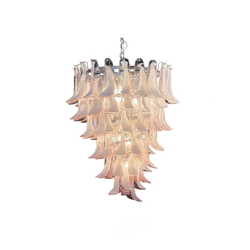 The Italian Vintage Pink Spiral Murano Chandelier is a breathtaking display of Venetian glass craftsmanship and elegance. Featuring a cascading spiral of delicate, hand-blown Murano glass petals in soft blush pink with white accents, this chandelier exudes sophistication and charm. Each petal is meticulously crafted, creating a harmonious balance of transparency and texture that catches and reflects light beautifully, filling the room with a warm, romantic glow.