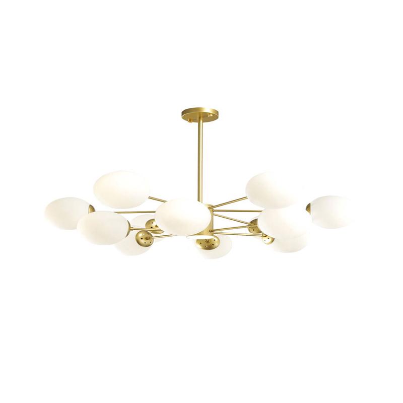 The unique design of the Karrington Chandeliers, with its antique brass and opal glass spheres, gives the impression of a product influenced by nature.