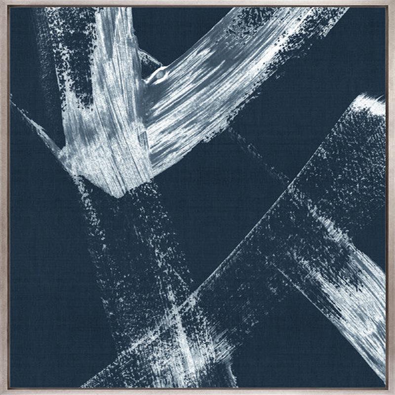 Bold white brushstrokes sweep across deep navy backgrounds, creating striking contrast and dynamic energy – perfect for adding graphic impact and modern sophistication to contemporary spaces.