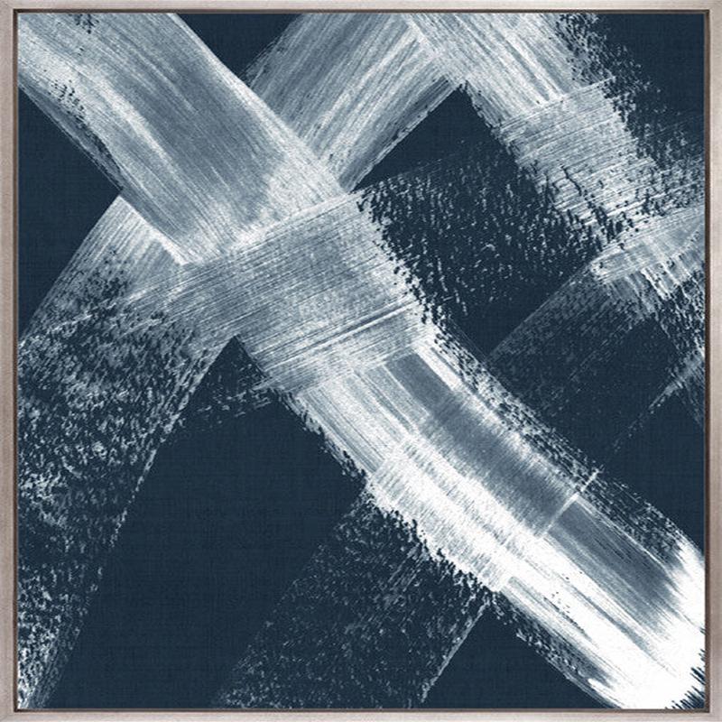 Bold white brushstrokes sweep across deep navy backgrounds, creating striking contrast and dynamic energy – perfect for adding graphic impact and modern sophistication to contemporary spaces.