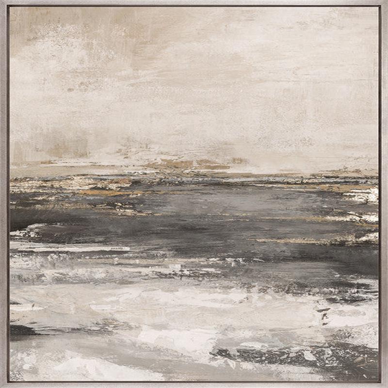 This winning abstract collection features layered textures and soft washes of ivory, sand, charcoal, and hints of gold. These pieces evoke misty landscapes and serene horizons with a sophisticated, organic palette and subtle metallic highlights.