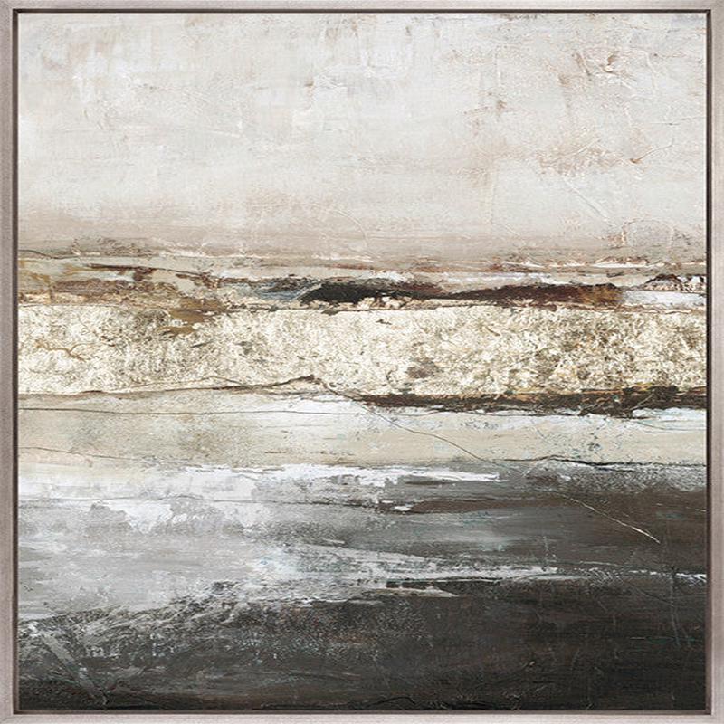 This winning abstract collection features layered textures and soft washes of ivory, sand, charcoal, and hints of gold. These pieces evoke misty landscapes and serene horizons with a sophisticated, organic palette and subtle metallic highlights.