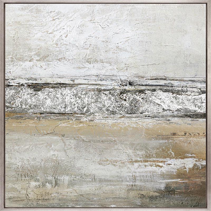 This winning abstract collection features layered textures and soft washes of ivory, sand, charcoal, and hints of gold. These pieces evoke misty landscapes and serene horizons with a sophisticated, organic palette and subtle metallic highlights.