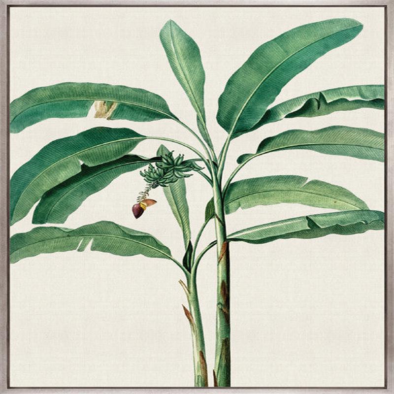 Lush tropical foliage with gentle, painterly texture in muted greens and creams, creating relaxed sophistication for elegant coastal-inspired spaces.