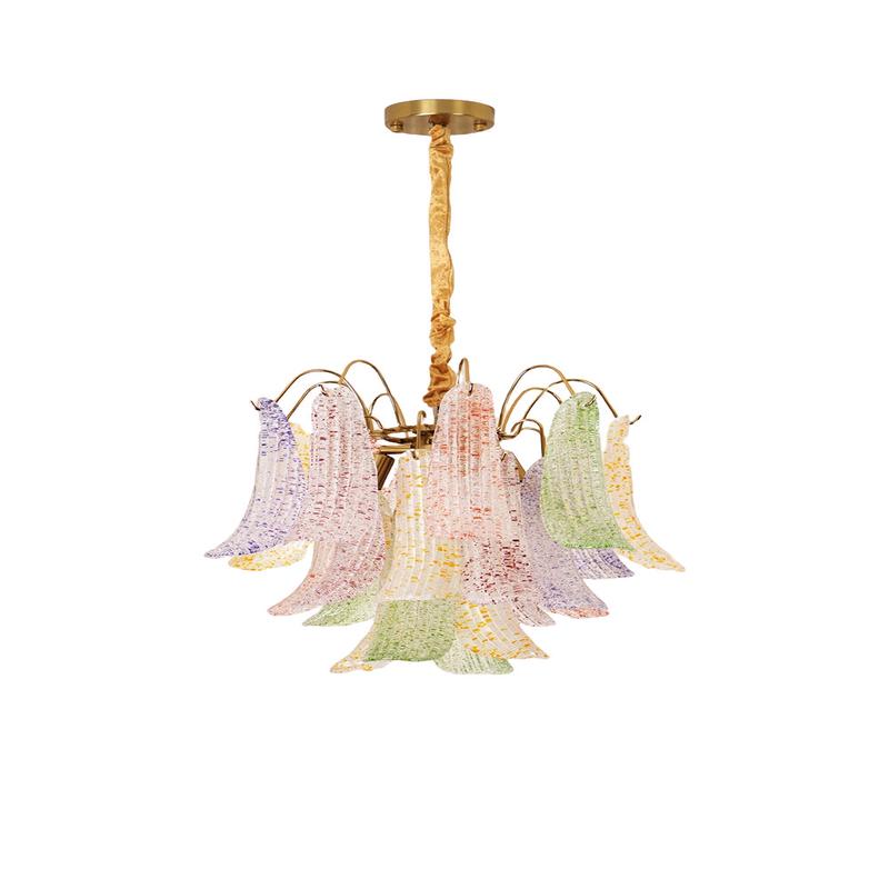 This Mazzega Murano colored glass chandelier showcases the superior craftsmanship and unique beauty of Murano glass art. The chandelier is composed of multiple pieces of hand-blown colored glass pieces, which present a natural and elegant petal shape, each with a delicate dotted pattern, and the colors include soft pink, green, yellow, purple and purple, like a blooming bouquet, injecting vitality and romance into the space.
