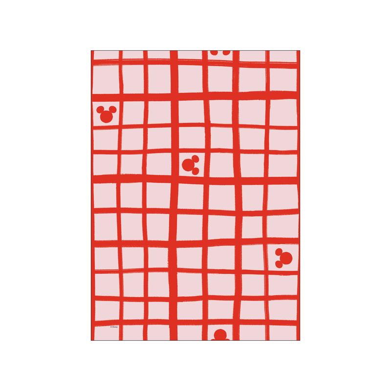 Bright red grid lines and scattered Mickey shapes bring a playful, modern twist to this bold and geometric pattern.