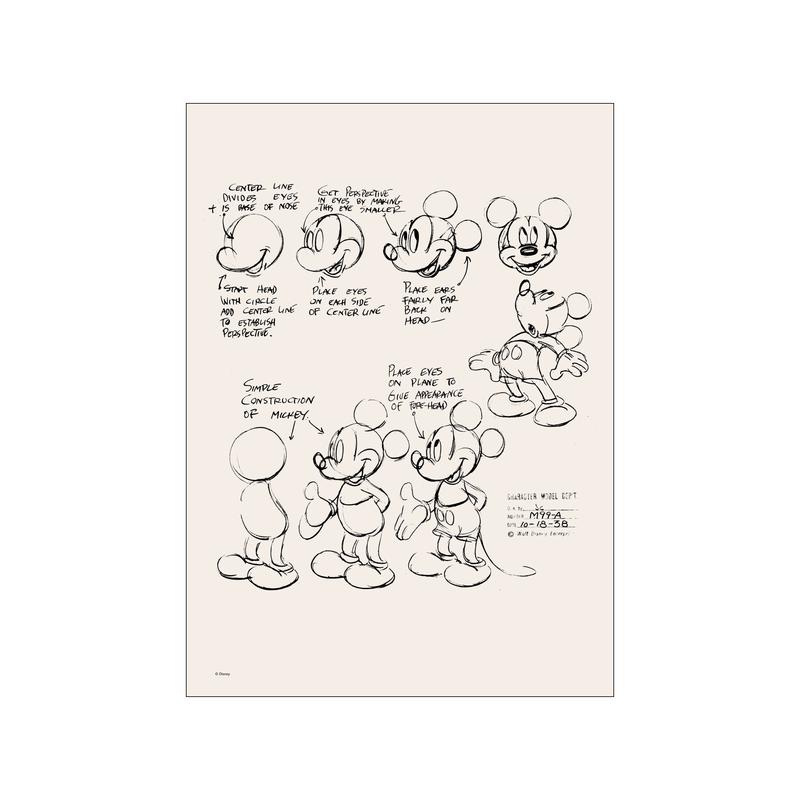 Step-by-step sketch guide of Mickey Mouse showing construction tips in timeless Disney style.