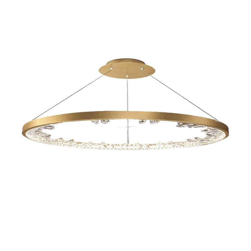 The Modern Halo Crystal Ring Chandelier boasts a luxurious and elegant design, combining crystal and metal materials for a dazzling lighting fixture. Its exquisite golden color and clear crystal lampshades give it a touch of opulence, making it a stunning centerpiece that adds grandeur to any space. The interplay of light and reflections between the golden metal frame and transparent crystal adds a mesmerizing touch of sophistication to the chandelier.