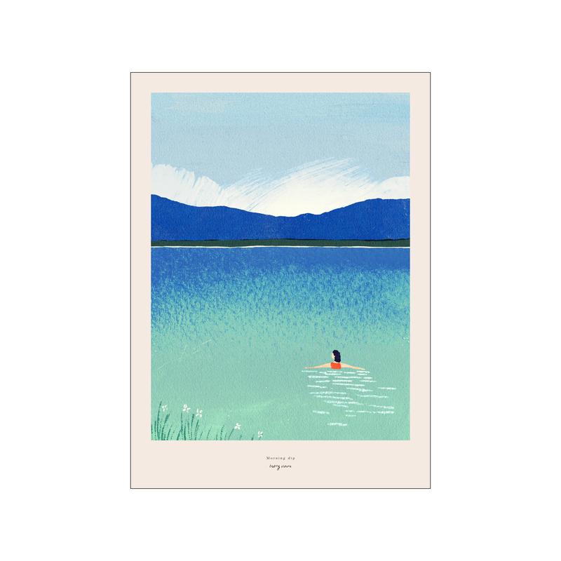 A woman wearing a red swimsuit wading into a aqua blue lake for a morning wild swim. Mountains in the distance. Travel vacation Illustration by Henry Rivers.