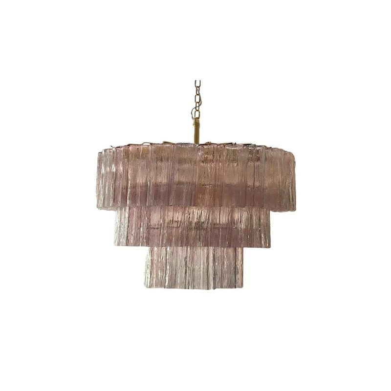 This Murano light pink glass tube chandelier shows its unique charm with its exquisite and elegant design and soft pink tone. The chandelier adopts a classic layered design, consisting of three layers of circular glass tubes, with clear layers and an elegant three-dimensional sense. The glass tube material is crystal clear, with delicate vertical textures on the surface, which creates a soft and dreamy light and shadow effect when the light penetrates.