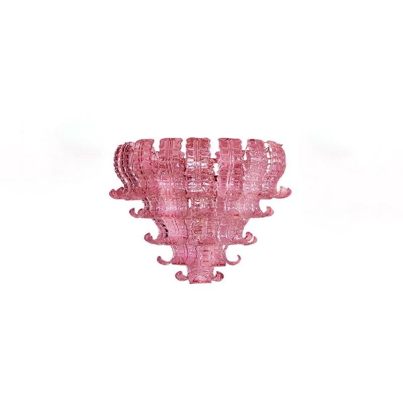 This Murano pink glass Felci chandelier is an artistic decoration that perfectly embodies the essence of Italian handmade glass craftsmanship. Its design is inspired by the fern leaves (Felci) in nature. The stacked pink glass pieces present a graceful curve. Each piece of glass is carefully handmade with subtle ripples and soft transparent texture, adding a delicate layering to the chandelier.