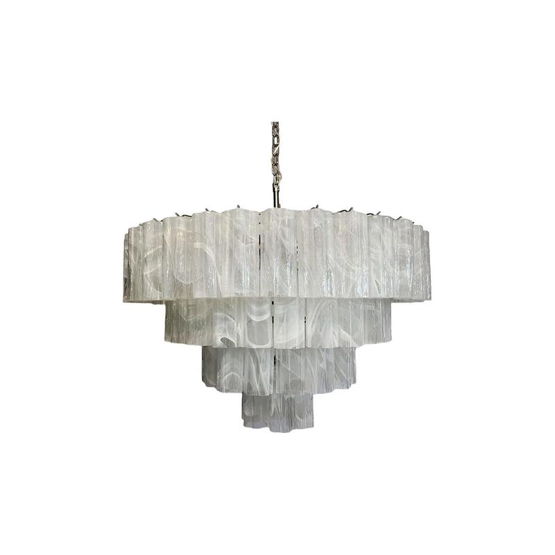 This Murano white glass tube chandelier is composed of 78 exquisite hand-blown glass tubes, perfectly blending modern design with traditional craftsmanship. The surface of the glass tubes is decorated with soft white swirl textures, giving the lamp a smart artistic beauty under the light. The layered structure gradually expands from top to bottom, creating a multi-dimensional visual effect while giving the chandelier an elegant streamlined appearance.