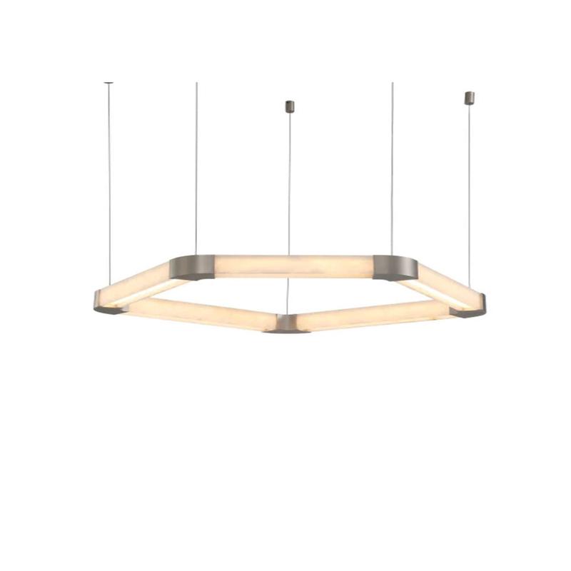 The Ola Single Alabaster Ring Chandelier features an elegant bow-shaped structure. Its modular construction, made up of gently curving linear components, can be showcased individually or combined in various configurations. When connected end-to-end, these units form a continuous ring of light, offering endless opportunities for linear design customization.