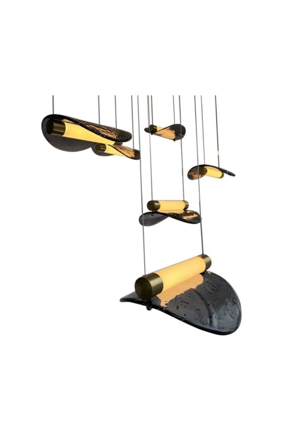 Paolo Castelli Manta Pendant Lamp is a scenographic suspension lamp whose ethereal lightness recalls the iconic Mobile sculpture by Alexander Calder. Amber coloured glass leave, hand-forged in Murano, encapsulated in a cylindrical satin brass structure which contains the LED light source. It has a delicate and sinuous shape and seems to be flying in the air, hanging from very thin electrified suspension cables.