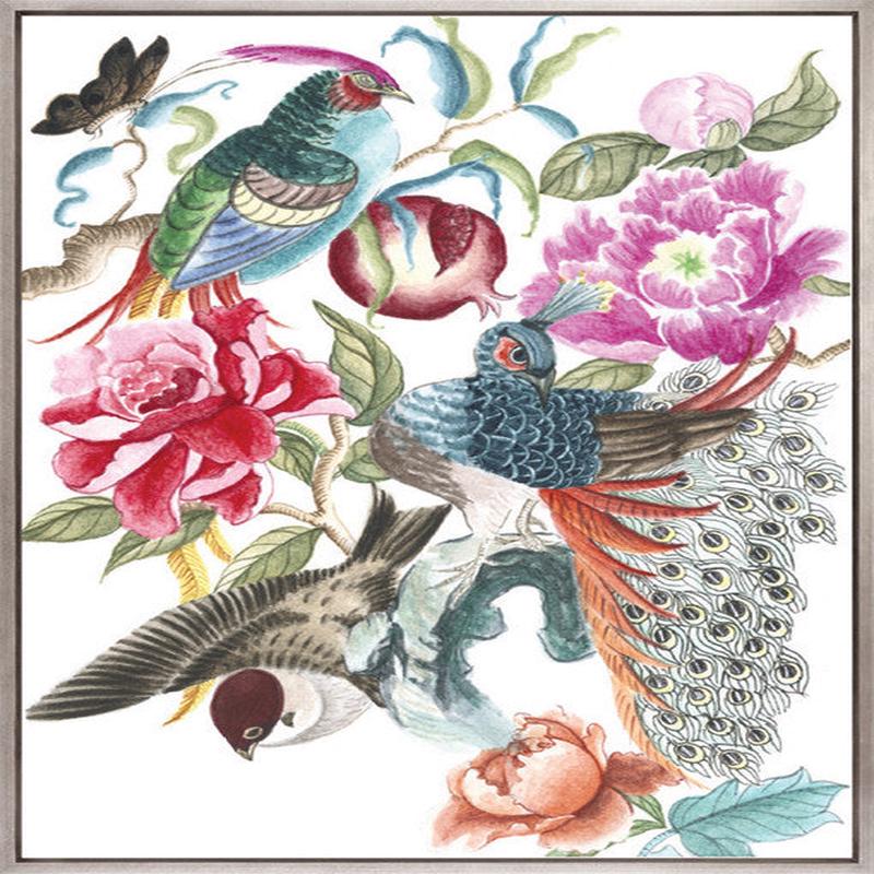 Beautiful hand painted Chinoiserie of meadow flowers and playful birds in watercolours.