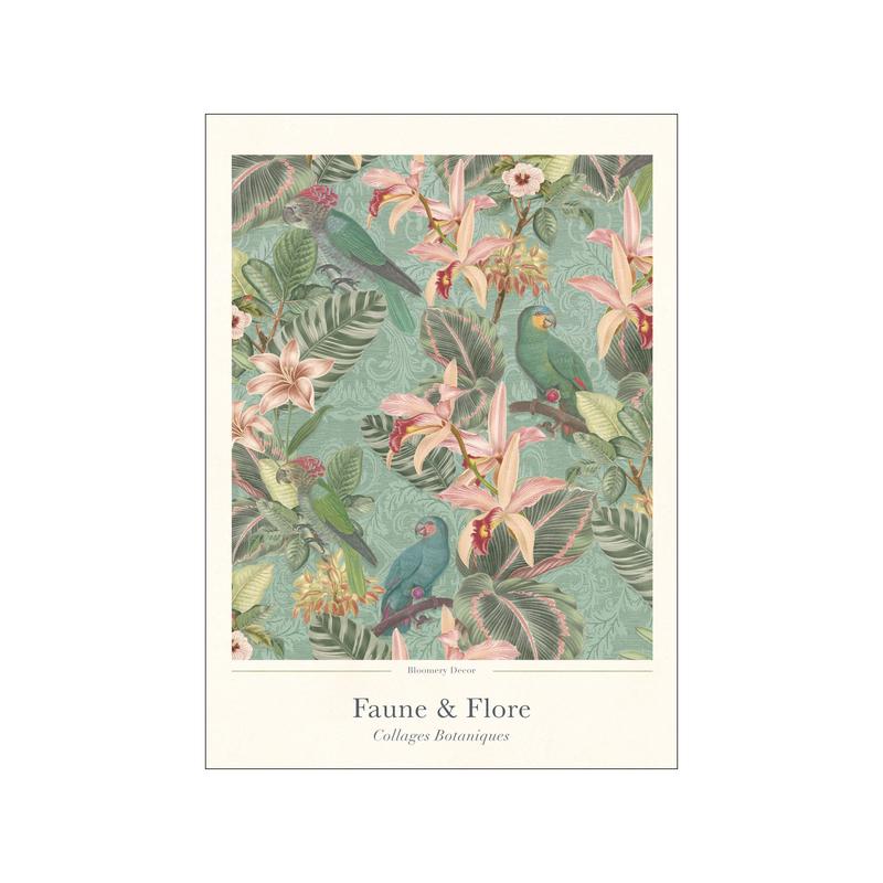 This collage art poster from the Faune & Flore collection showcases exotic parrots and orchid flowers set against an elegant teal green rococo pattern. A luxurious artwork blending tropical charm with historic decor, perfect for those who love sophisticated and timeless wall art.