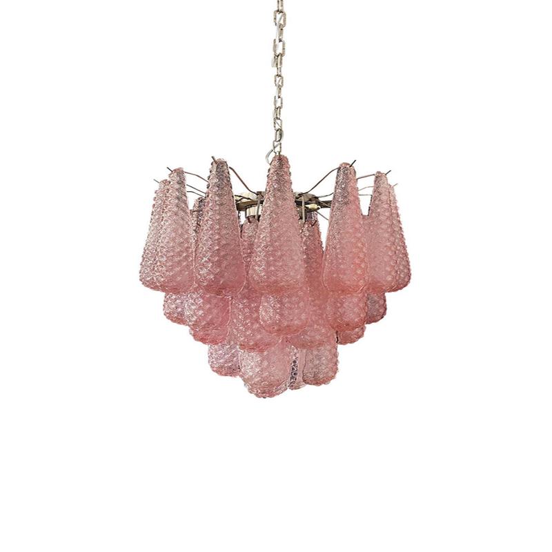 The Pink Murano Glass Teardrop Chandelier is a striking embodiment of elegance and Venetian craftsmanship. Featuring dozens of hand-blown glass teardrops in a soft pink hue, this chandelier creates a delicate yet bold statement. Each glass teardrop boasts intricate textured detailing, adding depth and dimension to its design, while the shimmering surface beautifully reflects and diffuses light, filling your space with a warm and inviting glow.