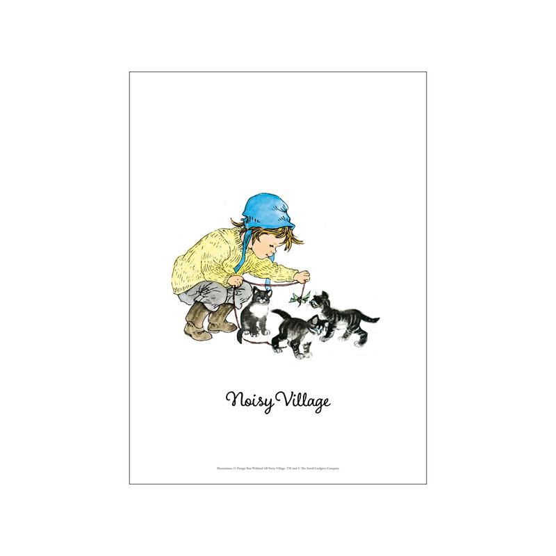 This sweet Noisy Village poster depicts Kersten playing with three lively kittens, their tiny tails up in excitement. A beautiful print for animal lovers and fans of Astrid Lindgrens timeless tales.