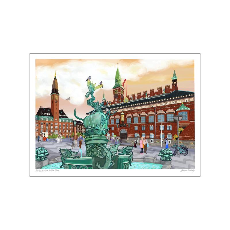 This artwork captures the lively atmosphere of Copenhagen City Hall Square (Rdhuspladsen). In the foreground, the Dragon Fountain with its turquoise-green sculptures and flowing water stands out, while pigeons perch on its figures. Behind it rises the striking red-brick Copenhagen City Hall, adorned with towers, spires, and golden details, glowing against a warm sunset sky. To the left, the Palace Hotel with its tall tower completes the scene, while people walk, cycle, and gather across the square, adding a sense of everyday life to the romantic depiction.