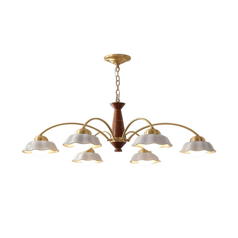 The Retro Tulip Brass Chandelier is a unique blend of brass, wood, and frosted opaline ceramics. Crafted with a keen attention to quality and intricate details, this chandelier boasts five hidden light sources cleverly concealed by opaline ceramic shades. The brass arms are artfully connected to a wooden centerpiece.